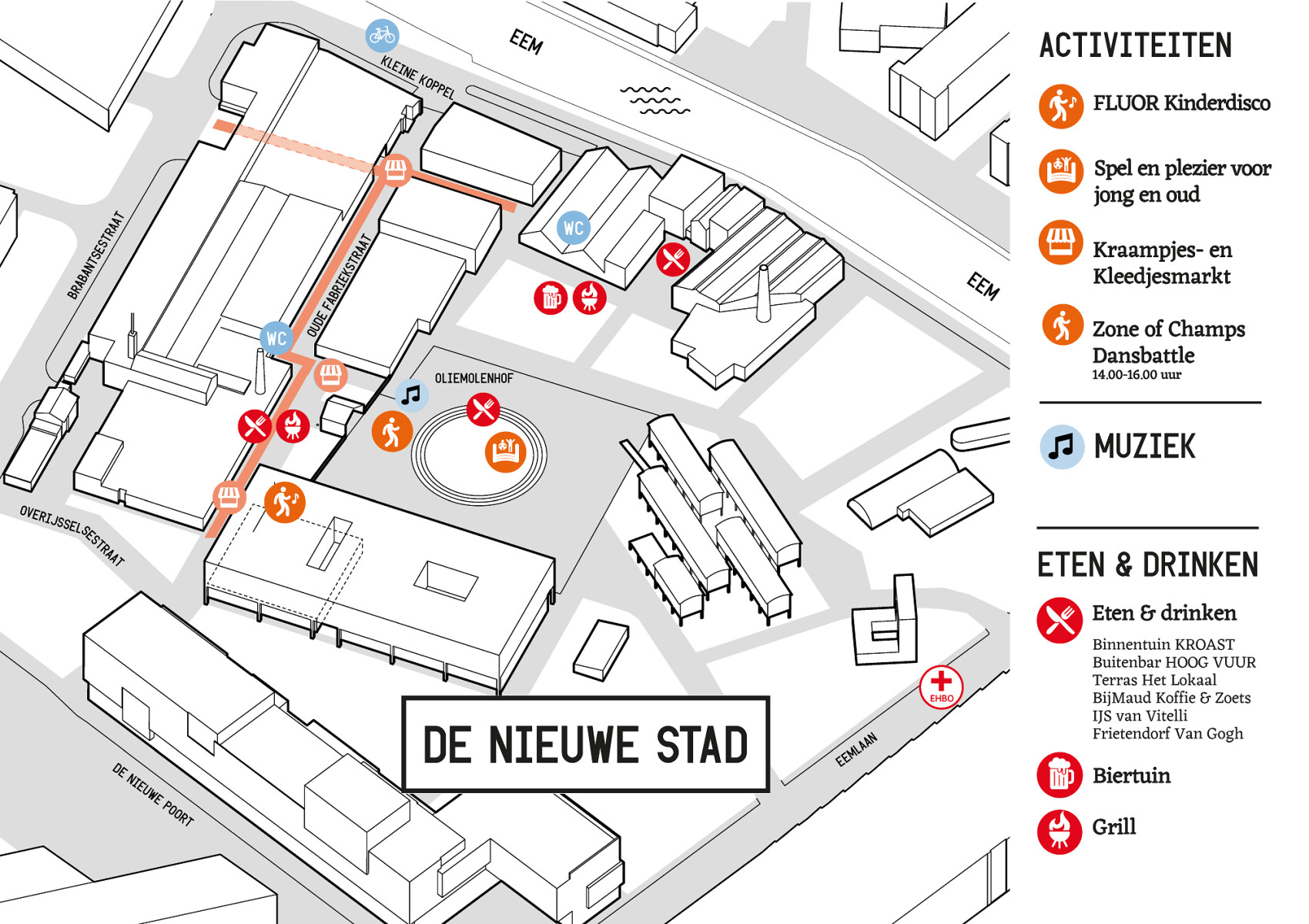Wil je weten waar je moet zijn voor de kleedjes- en kraampjesmarkt in De Nieuwe Stad, of voor een hapje en drankje? Bestudeer de plattegrond!