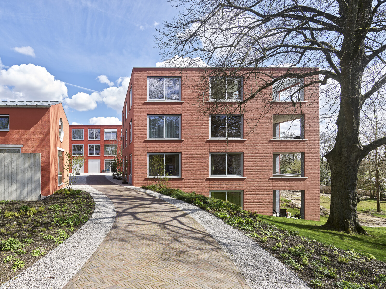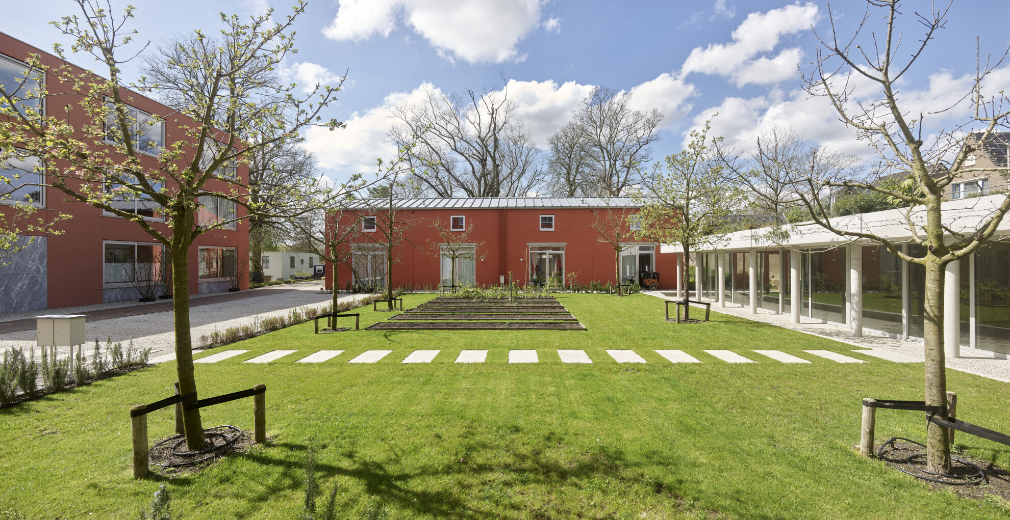 De drie clusters van gebouwen delen één samenhangend landschap. Er zijn verschillende gebruikersplekken en looproutes gedefinieerd. Deze zijn duidelijk herkenbaar door gemaaide zones, hoofdroutes van klinkers en paden van grind. Dit alles is onderdeel van een weelderig landschap vol bomen, heesters, bloemen en grassen.