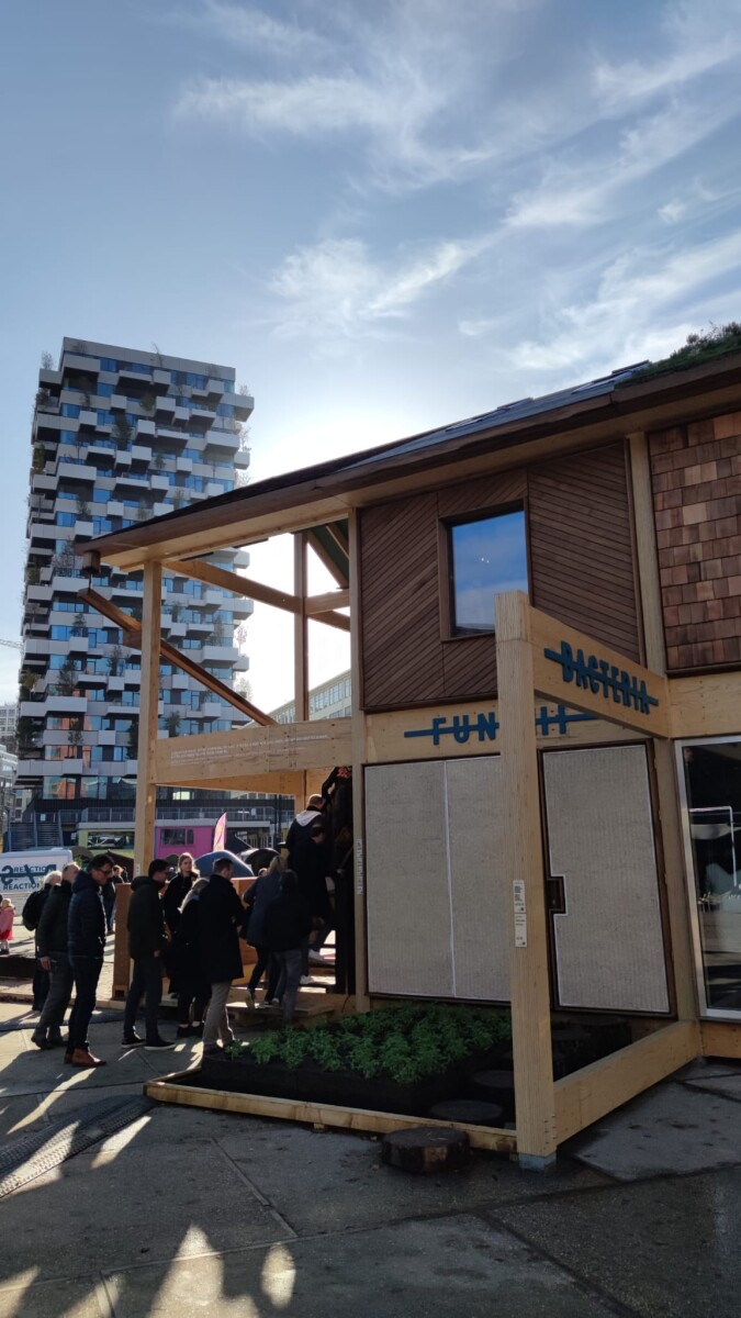 Een van de must-sees tijdens de DDW was 'The Exploded View Beyond Building'. Een iconisch huis met 100 biobased en circulaire bouwmaterialen waaronder Platowood. Een dakdeel is bekleed met Platowood Vuren en een geveldeel met Platowood Populier. Alle deuren, dakgoten, lijstwerk en details zoals deurgrepen zijn gemaakt van Platowood Fraké. In elke kamer in het huis is een andere bouwmethode toegepast en omdat je door het hele huis kan lopen zie, voel en ruik je alle gebruikte materialen. Naast Platowood passeren fungi, kurk, zeewier en zelfs algen de revue als potentiële materialen. Een zintuigprikkelende start van de vrijdag.