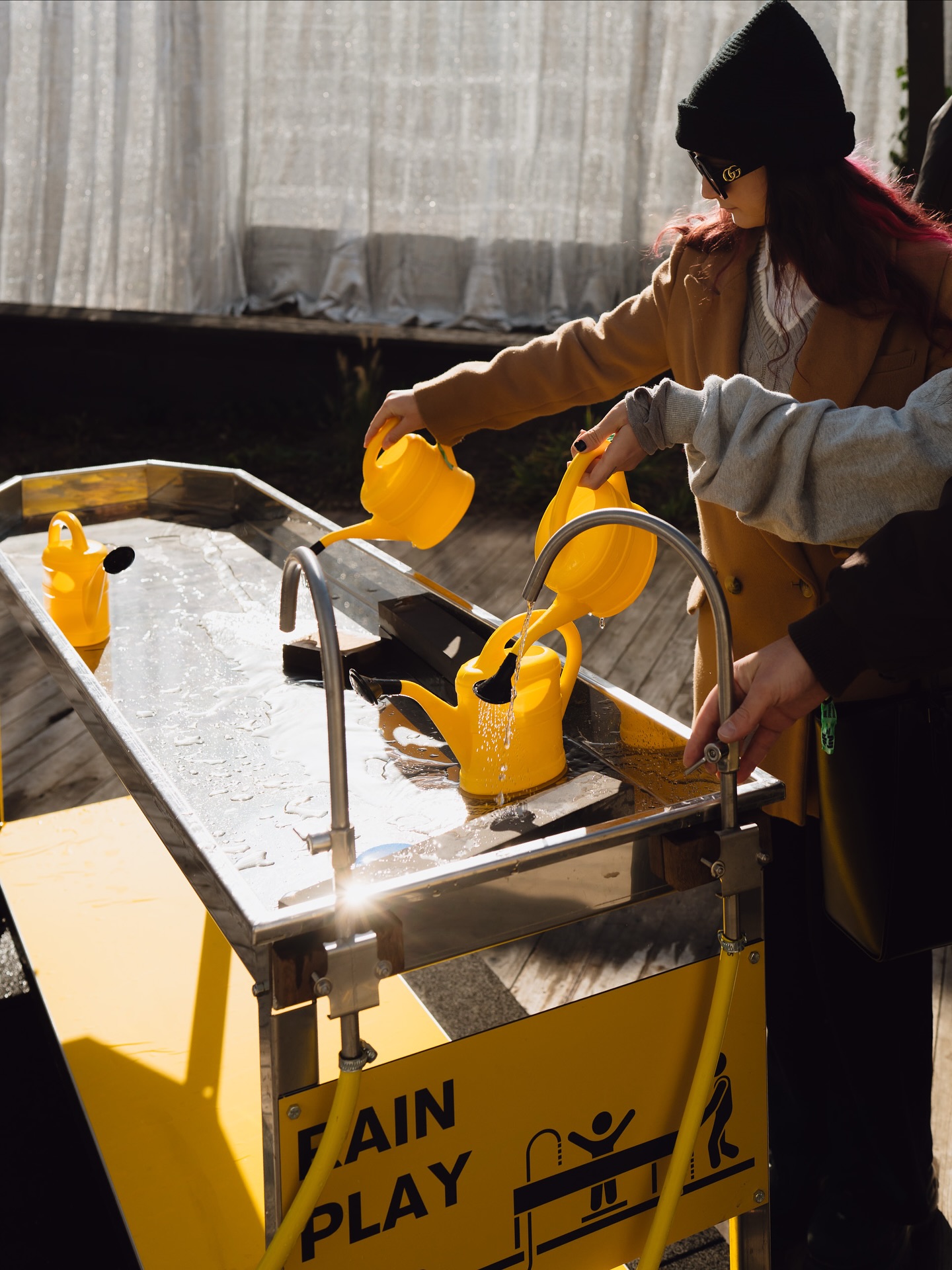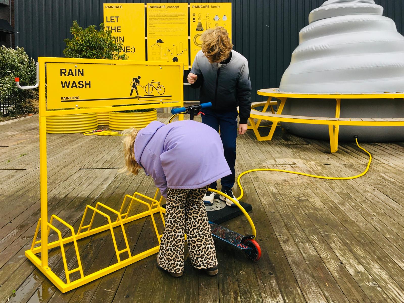 Raincafé combineert regenwateropvang met een plek in de openbare ruimte. De installatie vangt regenwater op, bewaart het en maakt het beschikbaar voor dagelijks gebruik: van het bewateren van groen tot het wassen van fietsen of spelen met water. Daarnaast functioneert Raincafé als een plek waar mensen samen kunnen komen. Door wateropslag en -gebruik zichtbaar te maken, nodigt de installatie uit tot reflectie en gesprek over waterbeheer en het gebruik van natuurlijke hulpbronnen in de stedelijke omgeving.