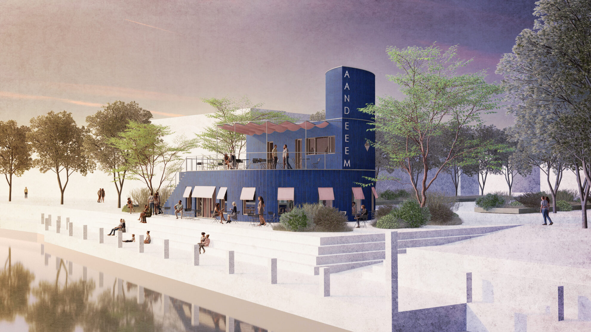Het paviljoen is bedoeld voor horeca, met ruimte voor ontmoeting en verblijf aan het water.