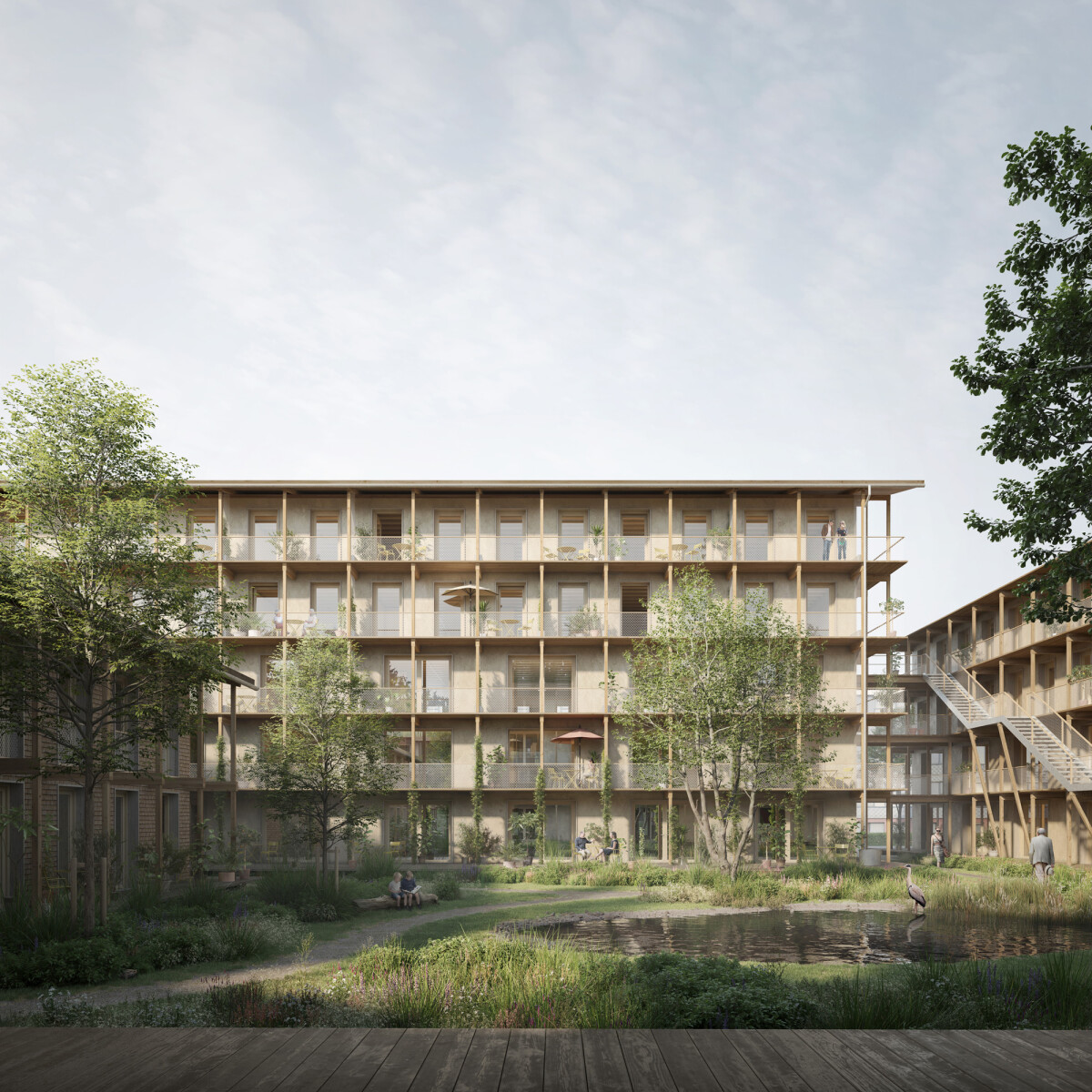 Met de Nieuwe Veenmarkt creëren we een,inclusieve woonomgeving, waar de gebouwen onderdeel zijn van het landschap. In ons ontwerp groeit de natuur door het blok heen: tussen, op, aan, rondom en zelfs onder de gebouwen, waardoor bijzondere leefgebieden ontstaan voor veel verschillende dieren en planten. We tillen de gebouwen iets op, zodat een doorwaadbaar gebied ontstaat voor flora en fauna. Voor de bouw van de woningen gebruiken we hernieuwbare biobased materialen uit de omgeving: hout uit de Sallandse bossen, leem uit de omgeving van de IJssel en vlas van boeren uit het ommeland. Ondanks de hoge dichtheid is de natuur overal.